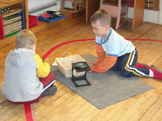 Despite the gloomy weather, the classroom was a busy, happy place all week. Along with lots of exciting math, language and practical life work, we had fun apple stamping with fall colors, moving like fish and birds with our Carnival of Animals CD (and movement scarves, of course), doing nature collages and performing puppet shows.