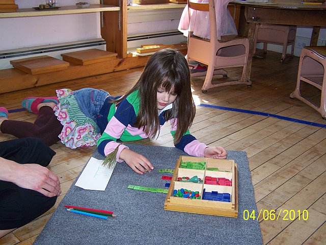 The Stamp Game is used for static (no exchanging or carrying) addition. It is more abstract than using the bead material for addition but the child is still manipulating the material to reinforce the concrete addition process.