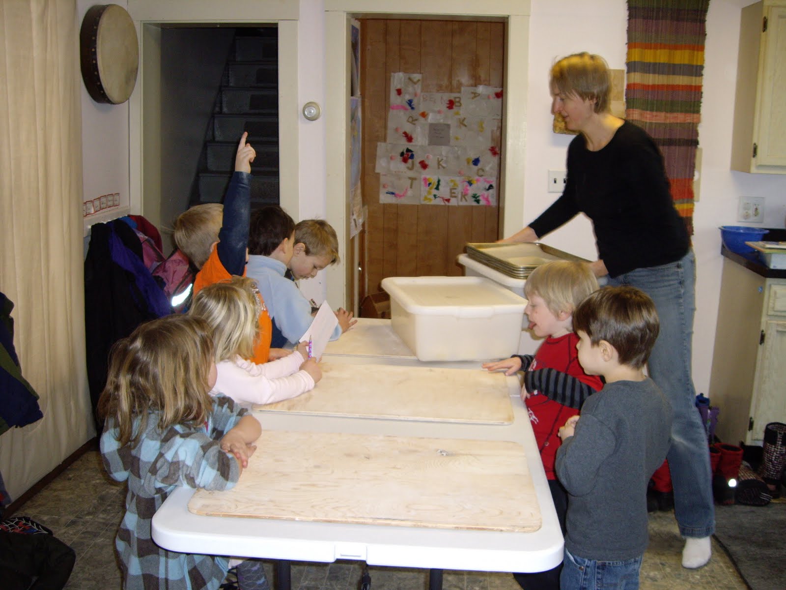 “The wind it whooshed, the snow it whirled/ / Bare trees shook like chilly bones./ Children grumbled in their homes.” Sound familiar? We had the cure for the winter blues though…On Tuesday Magda came to read a story called, “Sun Bread” about a baker who bakes sun-shaped loaves of bread to brighten up the town during the dreary winter. After the story, the children got to make their own sun bread. They kneaded and rolled out the dough and made some very beautiful and yummy looking sun bread. Thank you Magda! It was such a great experience for the children and the perfect activity for a winter day.