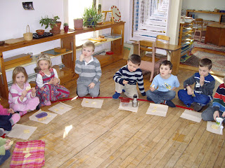 On Thursday we made butter from whipping cream. We placed some whipping cream in a jar and observed the change from cream to butter as we took turns shaking the jar. We sat in a circle and each child had two turns to shake the cream as we sang “The Butter Boogie”